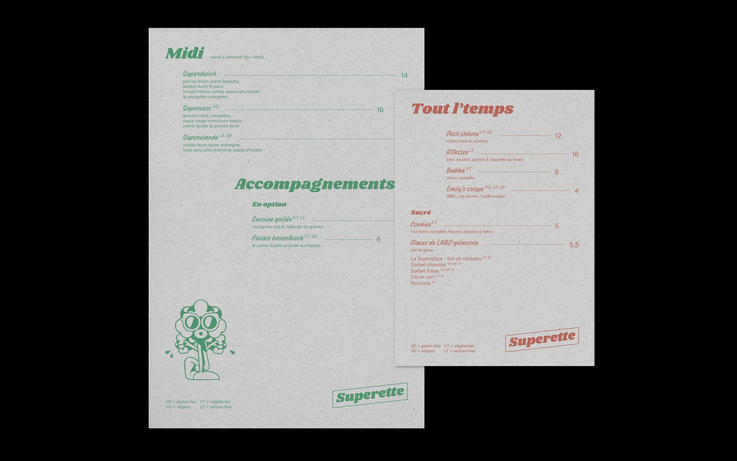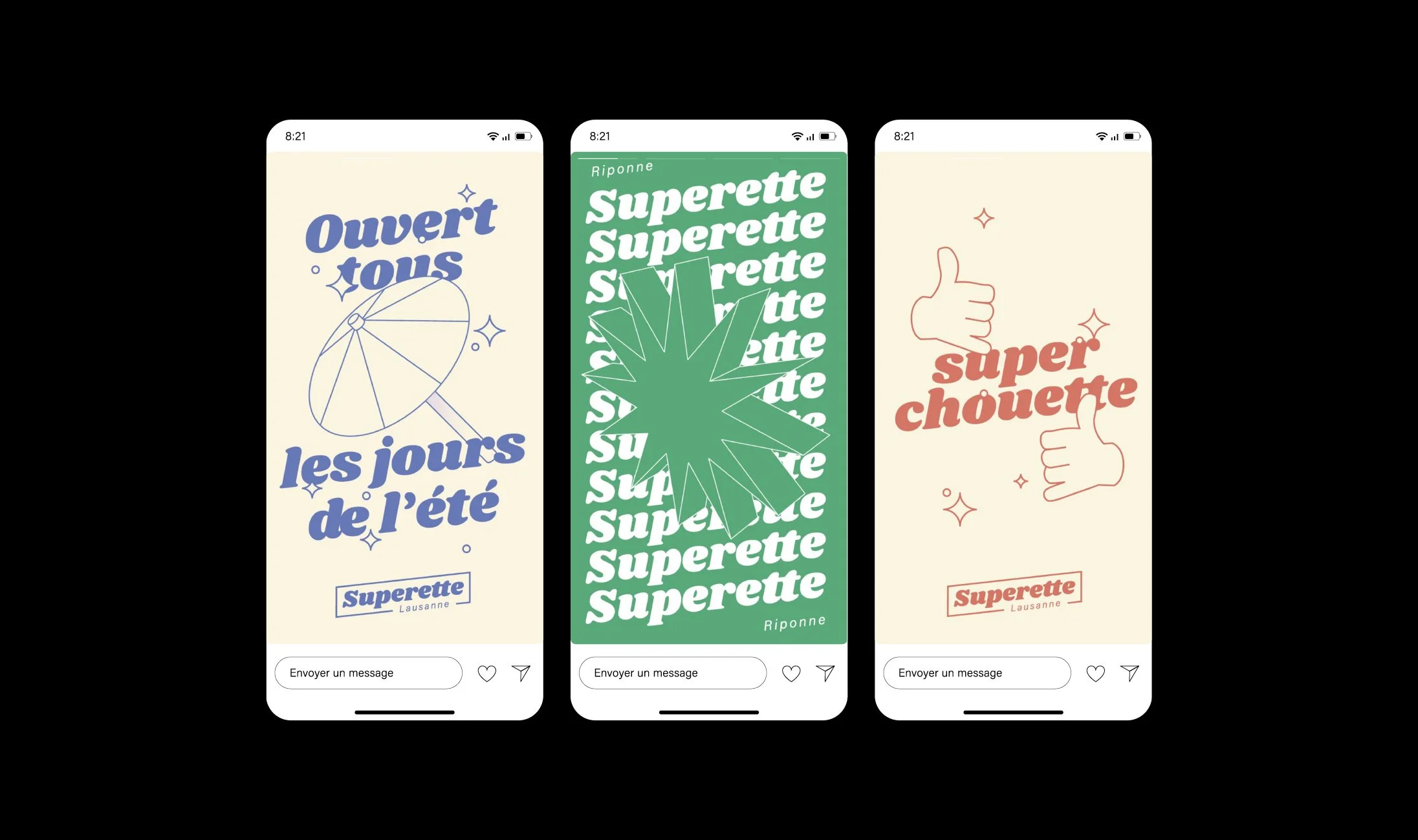 Réalisation de l'identité et des différents supports de communication pour La Superette, buvette en plein air, sur la place de la Riponne, à Lausanne.